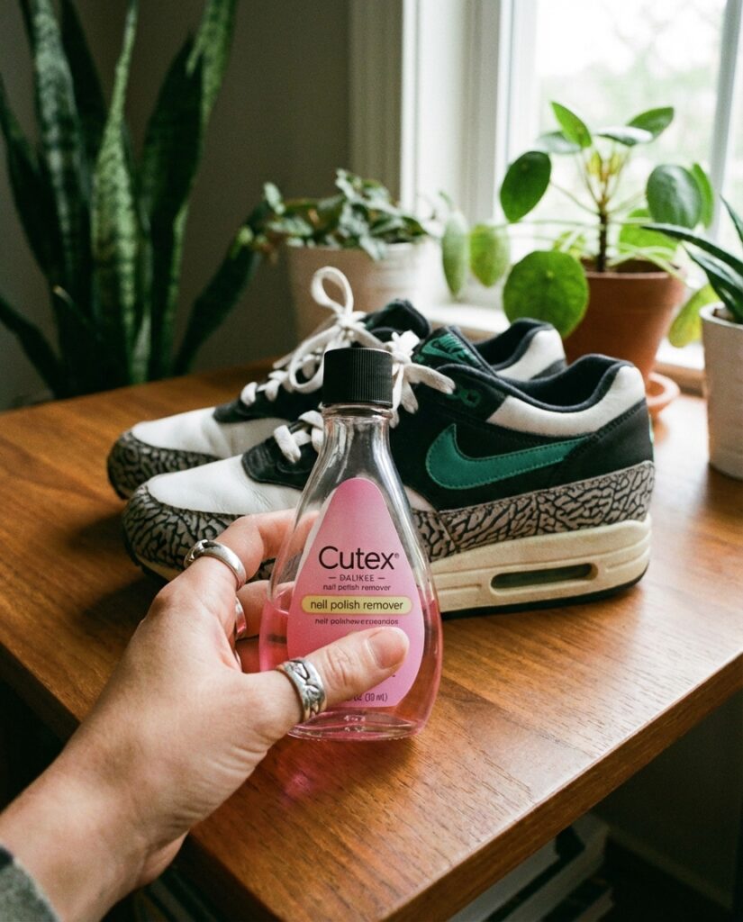 De oplosmiddelen in nagellakremover weken het vuil en bepaalde vlekken los van het oppervlak van de zool.