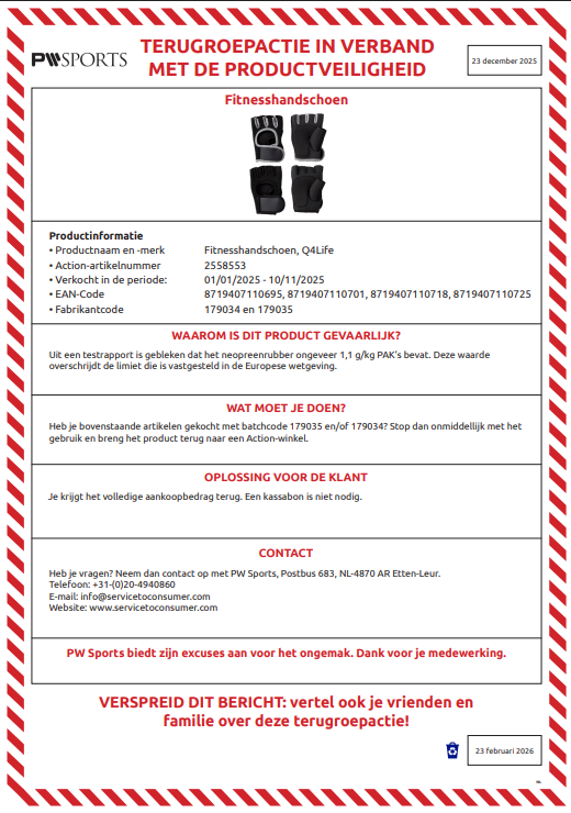 Action roept een populair sportartikel terug dat in Nederland is verkocht. Het gaat om fitnesshandschoenen van Q4Life. Een recente test laat zien dat het product niet voldoet aan de Europese veiligheidsregels. Je wordt daarom met klem gevraagd het niet meer te gebruiken en het in te leveren bij een Action-winkel.