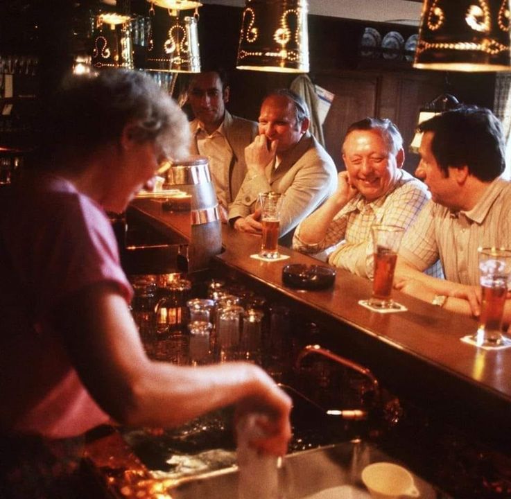 Precies! Dit beeld laat iets zien wat je tegenwoordig nog zelden ziet: onverdeelde, echte aandacht. Geen scherm, geen oortjes, niemand die wegdraait om snel een appje te tikken. Gewoon mannen aan de bar, pratend, lachend, misschien wat mopperend — maar vooral samen.