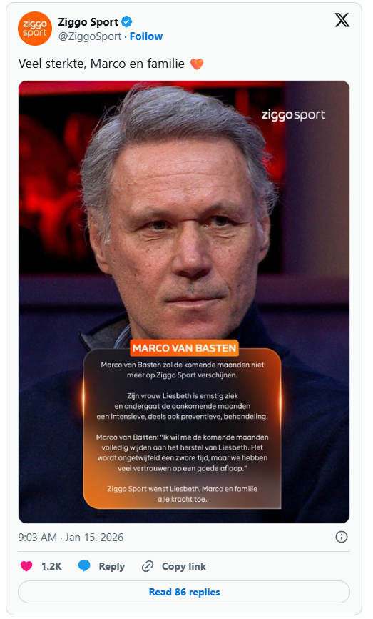 Bij Ziggo Sport kwam het nieuws hard binnen. Directeur Marcel Beerthuizen zegt diep geraakt te zijn en leeft mee met Van Basten en zijn gezin. Op sociale media zie je dat kijkers en voetbalfans massaal reageren met steun en warme woorden.