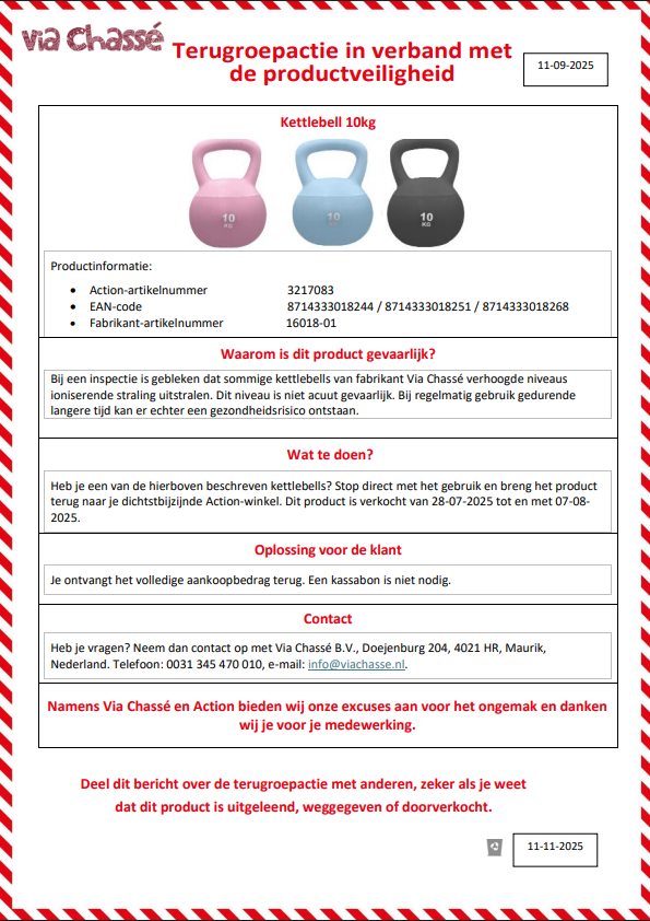 Bij een controle is vastgesteld dat sommige kettlebells van fabrikant Via Chassé een te hoog stralingsniveau hebben. De kans op directe schade is klein, maar regelmatig en langdurig gebruik kan wel nadelig zijn voor je gezondheid. Daarom halen Action en de fabrikant het product per direct uit de verkoop en adviseren ze om het niet meer te gebruiken.