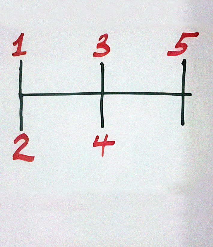 Er zijn van die puzzels die simpel ogen, maar pas boeiend worden zodra je doorhebt waar je eigenlijk naar kijkt. In eerste instantie lijkt de schets niet meer dan wat lijnen met cijfers erbij: 1 en 2 links, 3 en 4 in het midden en rechtsboven een 5. Als je ooit in een handgeschakelde auto hebt gereden, zie je direct dat dit precies het schakelschema van een klassieke versnellingsbak is.