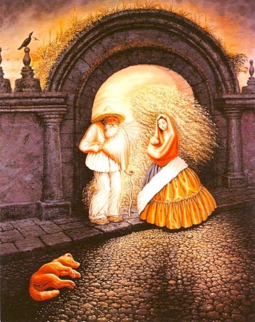Er is nog een speels extraatje. Sommige kijkers tellen ook de hond die ergens in de compositie rondsnuffelt. Doe je dat, dan kom je royaal uit op tien “gezichten” — al is dat natuurlijk een beetje smokkelen. Het blijft leuk om te merken hoe Ocampo met vormen speelt, waardoor je steeds denkt: hé, dat lijkt óók een snuit… of is het toch gewoon steen en schaduw?