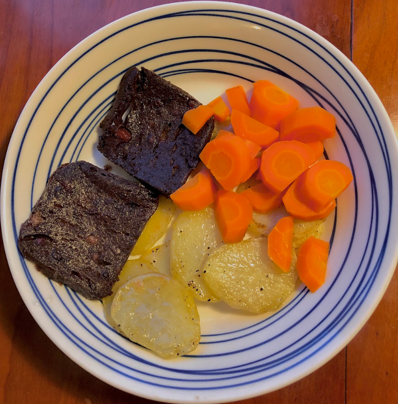 Op dit bord ligt een portie van zo’n gerecht waar de één warm van wordt en de ander juist rillingen van krijgt: balkenbrij. Een ouderwetse Hollandse klassieker, vaak gegeten met gebakken aardappeltjes en wat groente, zoals hier met worteltjes.