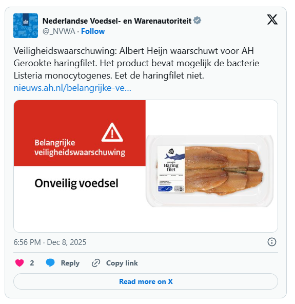 Het betreft gerookte haringfilet van het AH-huismerk met een houdbaarheidsdatum van 20 december 2025, meldt Hart van Nederland. De mogelijk besmette verpakkingen zijn vermoedelijk verkocht tussen 3 en 8 december. Heb je het product in huis, breng het dan terug naar de winkel. Je krijgt het volledige aankoopbedrag vergoed; dat kan ook via de online klantenservice.