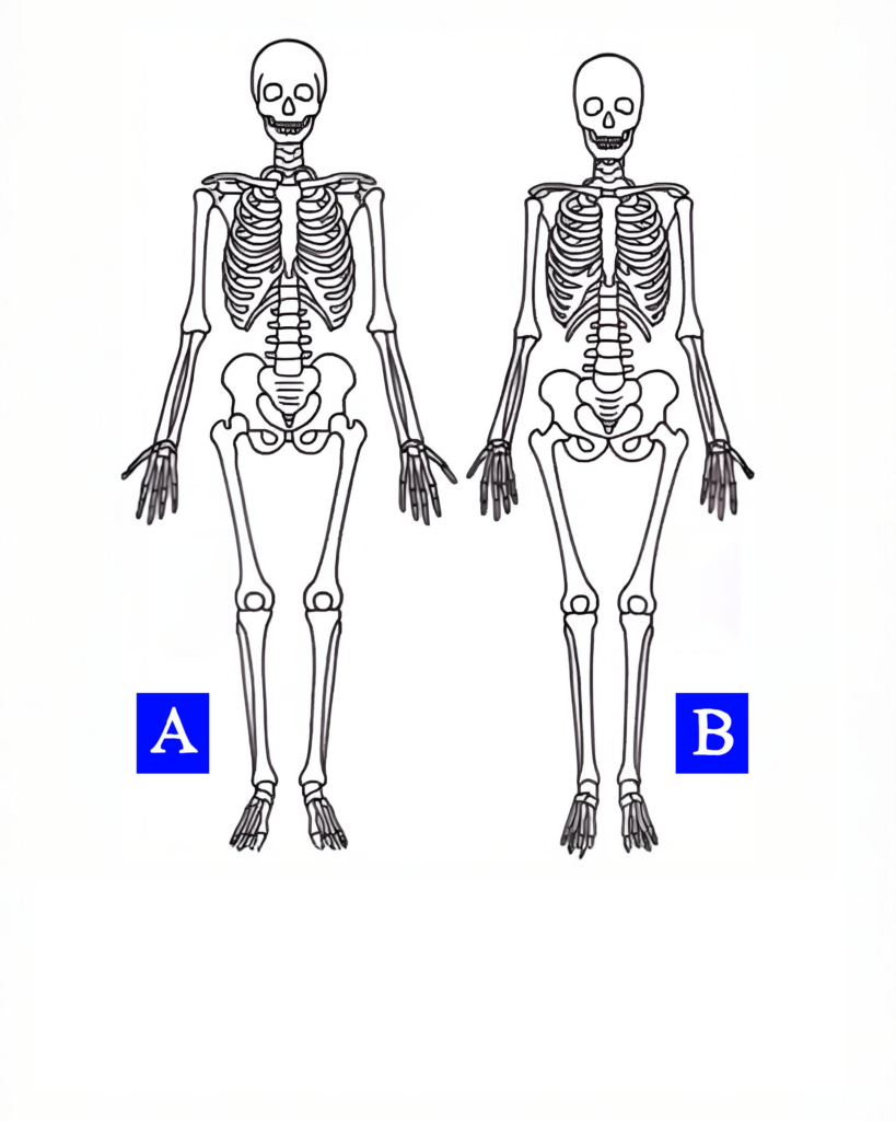 Stel je een illustratie voor met twee skeletten, A en B. Het lijkt simpel: ze staan hetzelfde, de botstructuur oogt gelijk en op het eerste gezicht zie je geen grote verschillen. Toch is er één onderdeel dat bijna altijd uitsluitsel geeft. Dus: welke van de twee is vrouwelijk?